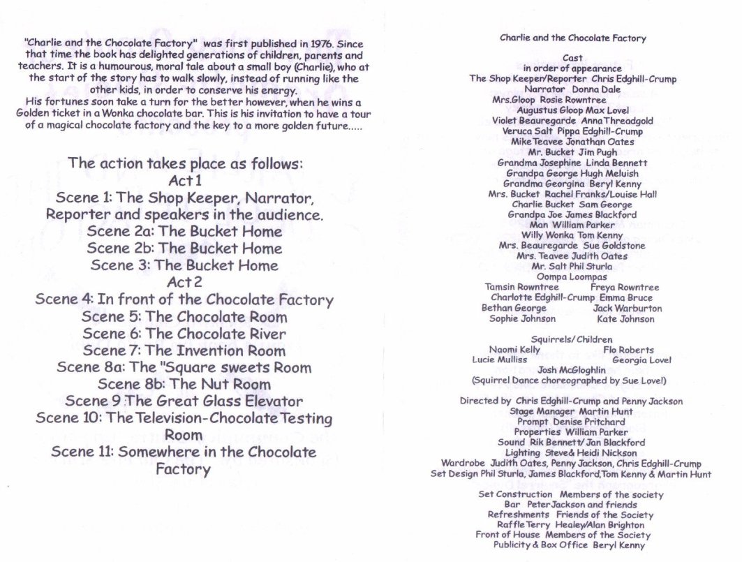 November 2004 Charlie & The Chocolate Factory by Roald Dahl Directed by Penny Jackson & Chris Edghill-Crump A play adapted by Richard George